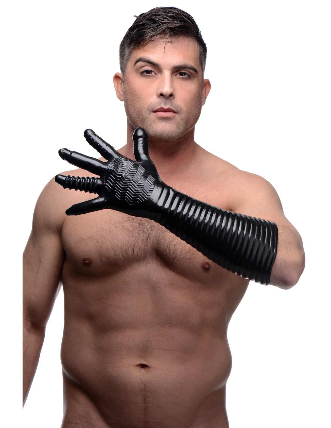 Ce gant long est texturé pour des moments de jeux encore plus excitants.Il est composé d'une surface en zig-zag sur la main et des nervures sur le bras.Chaque doigt possède une texture: lisse, nervurée, forme phallique, avec points bulles et forme de plug.